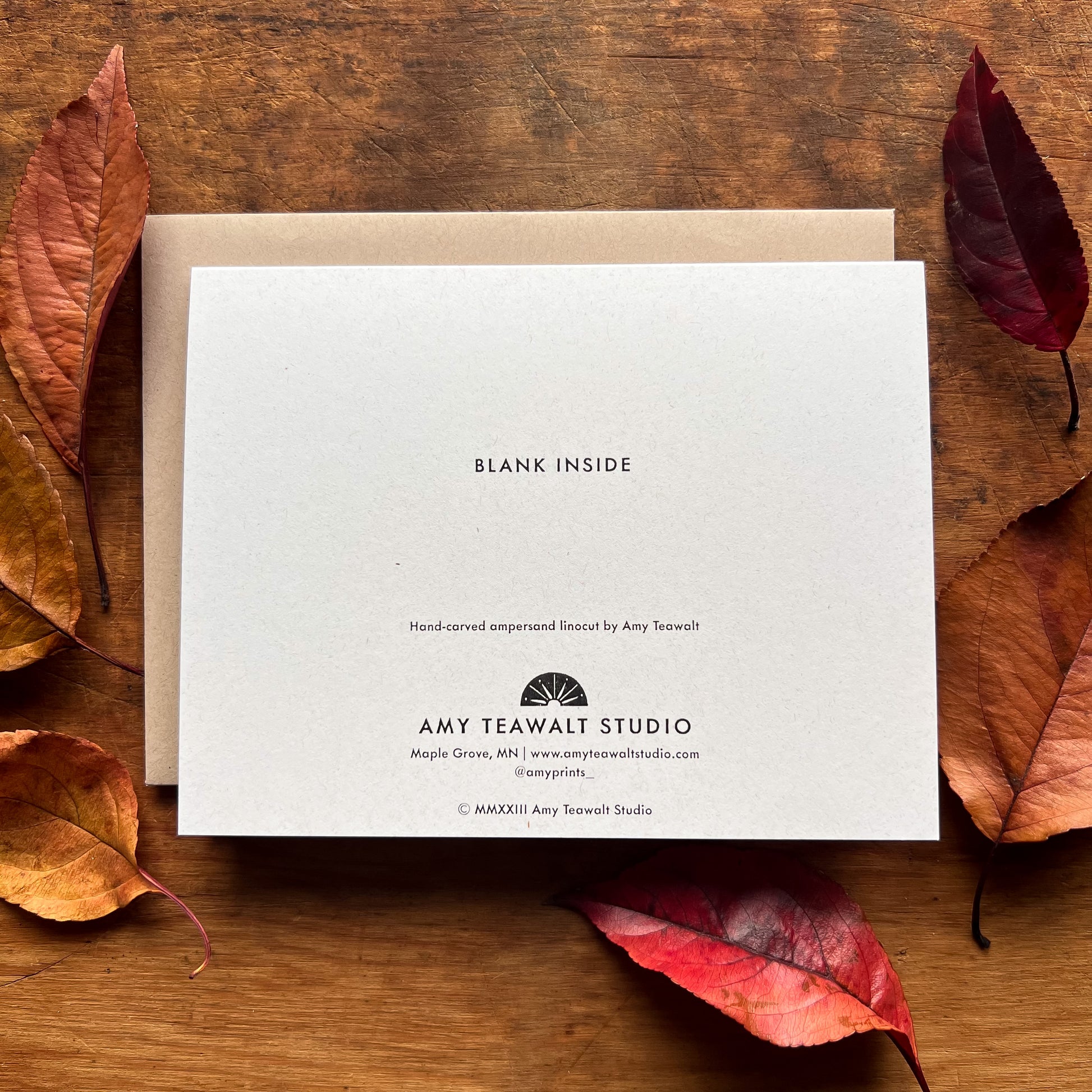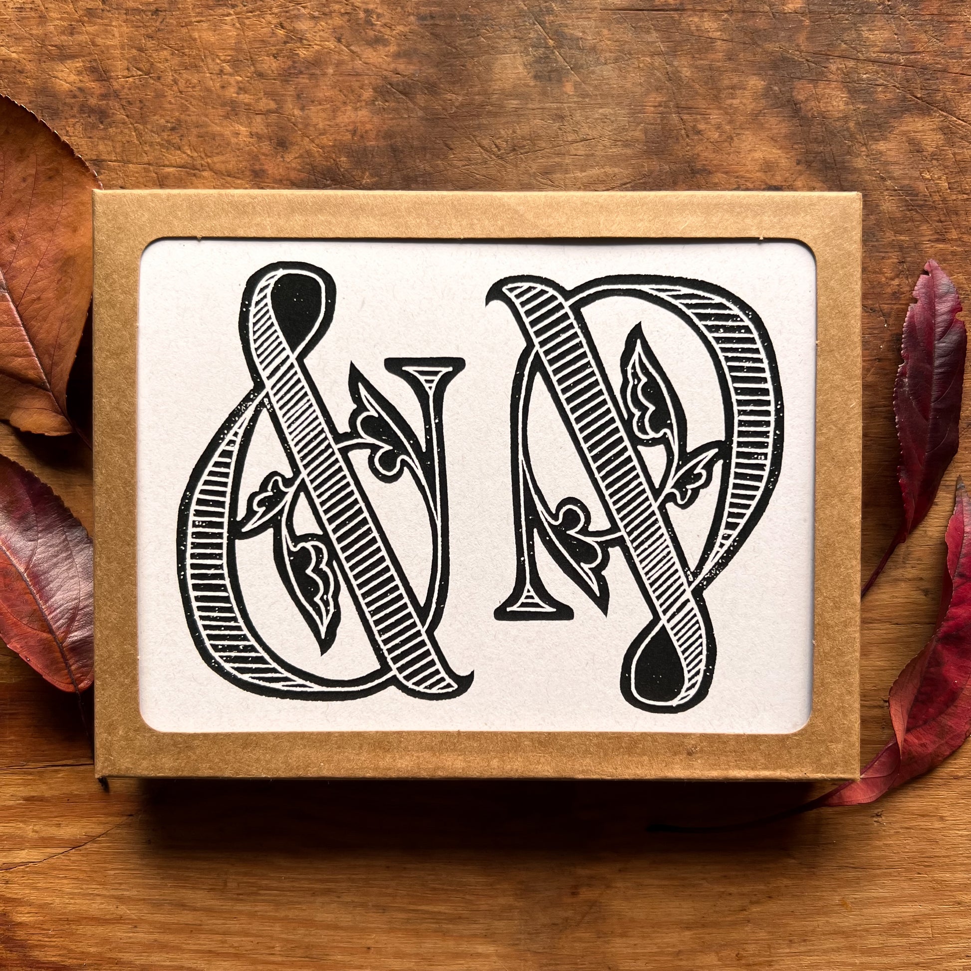 Send greetings that any type lover would enjoy with my ampersand greeting cards! Each card features my hand-carved Victorian ampersand block print and is locally printed on sturdy 100% recycled paper for added texture and interest. Available in both individual cards or as a box set of 6. 4.25x5.5” inches (A2 folded size).