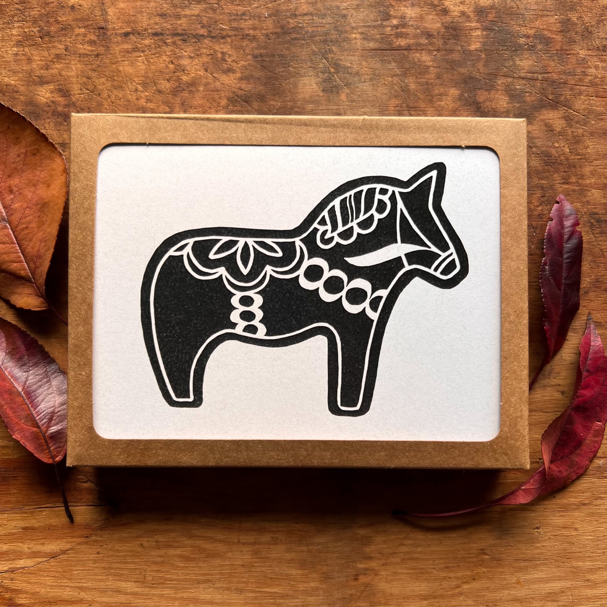 Send greetings that celebrate Scandinavian culture with my dala horse greeting cards! Each card features my hand-carved dala horse block print and is locally printed on sturdy 100% recycled paper for added texture and interest. Available in both individual cards or as a box set of 6. 4.25x5.5” inches (A2 folded size).