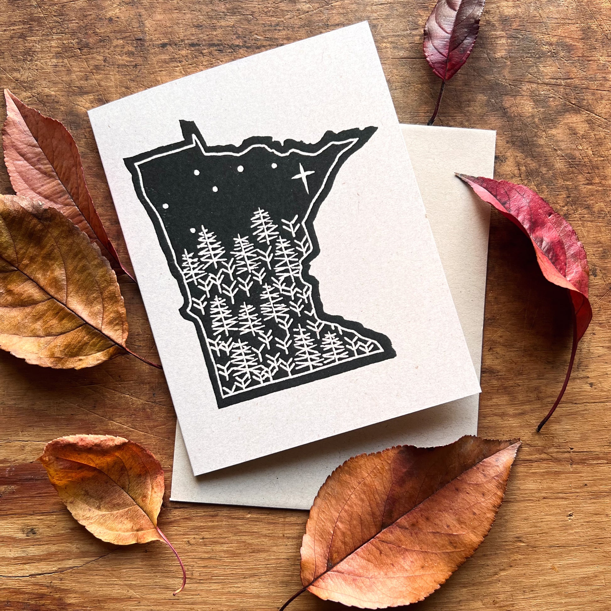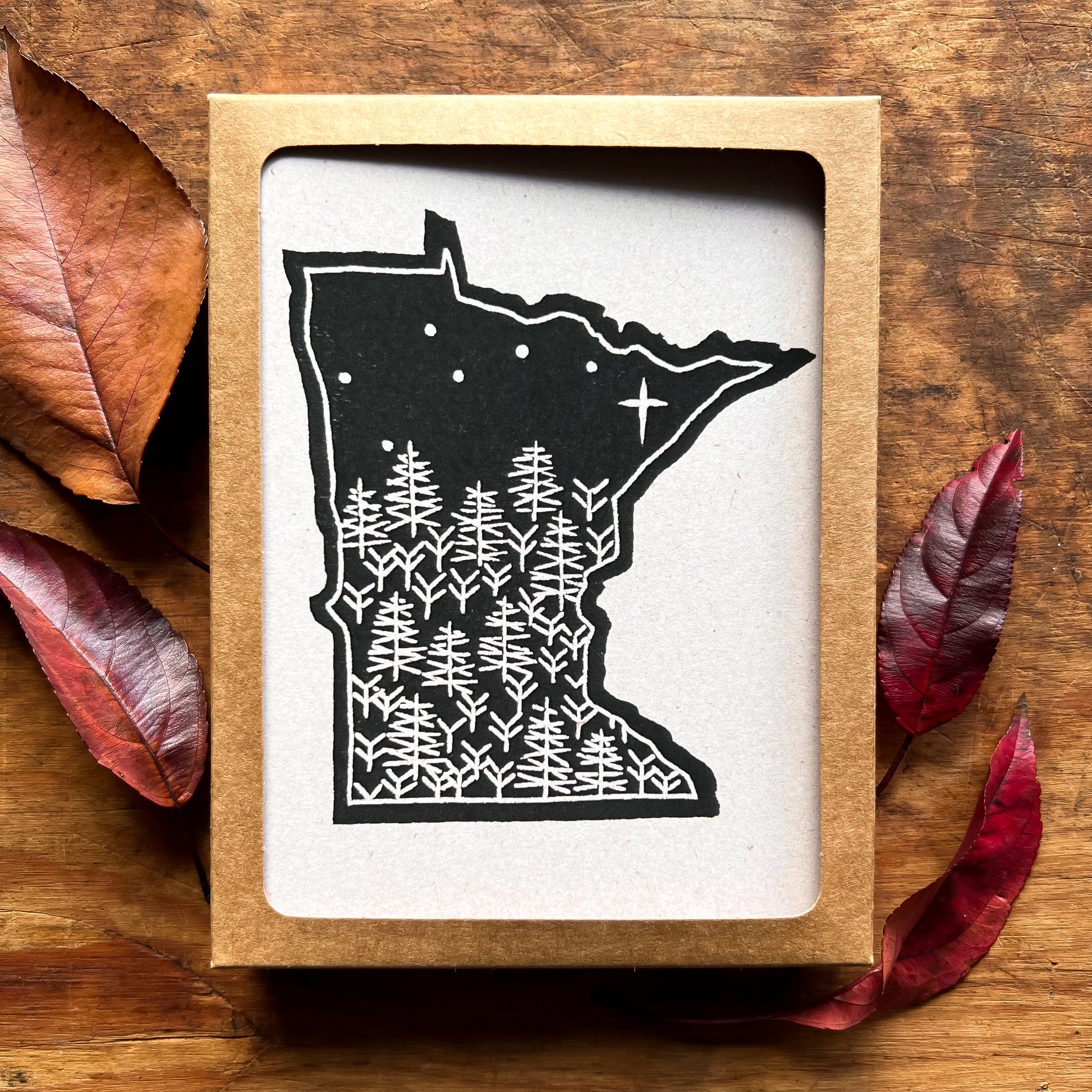 Send greetings from the North Star State and celebrate the beauty of Minnesota with my North Star State greeting cards! Each card features the original linocut print “North Star State,” and is locally printed on sturdy 100% recycled paper for added texture and interest. Available in both individual cards or as a box set of 6. 4.25x5.5” inches (A2 folded size).